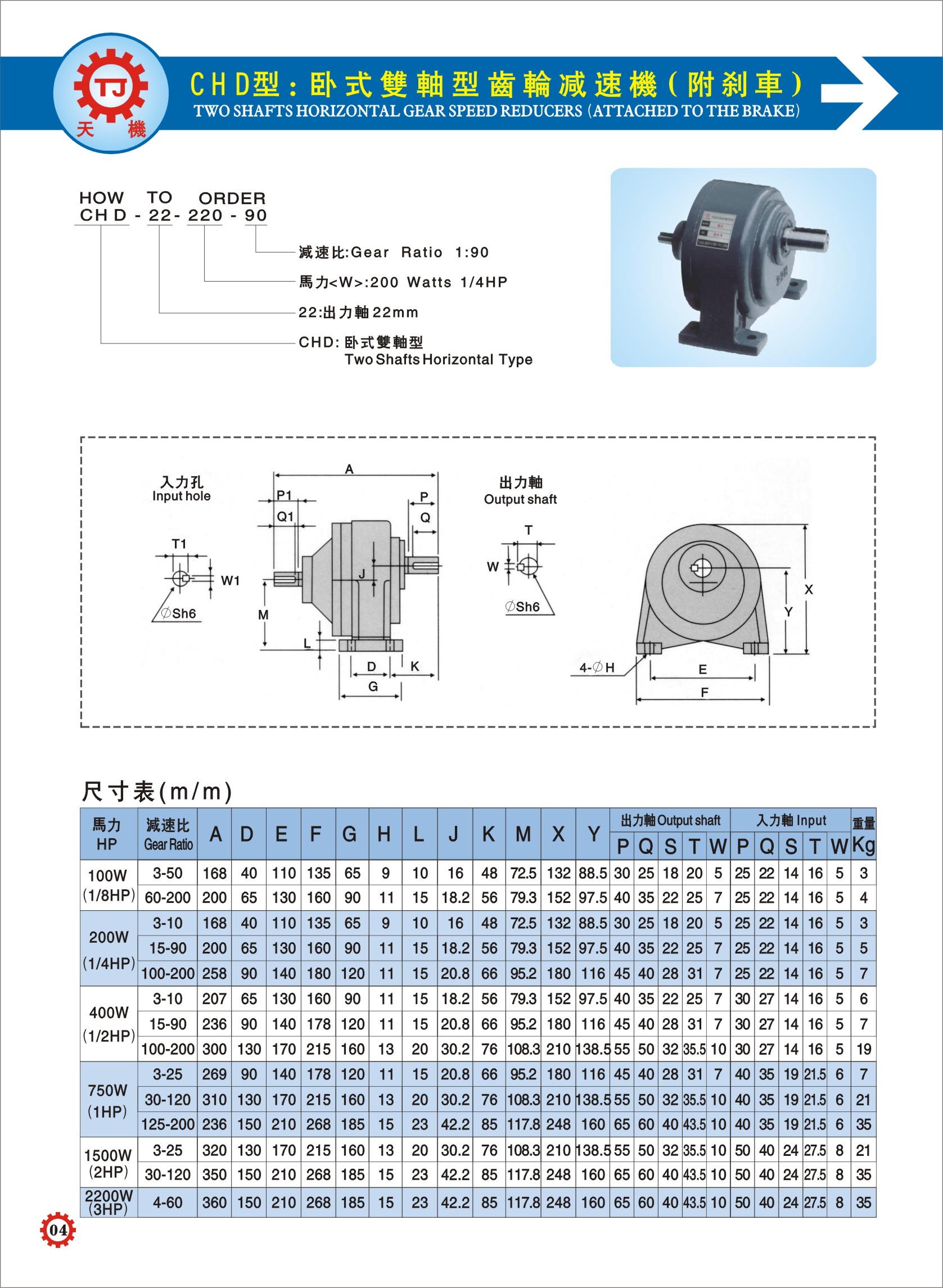 TJ-CHM臥式直結(jié)型齒輪減速機馬力1/4HP~5HP,減速比i=3~200,孔徑11~28mm。