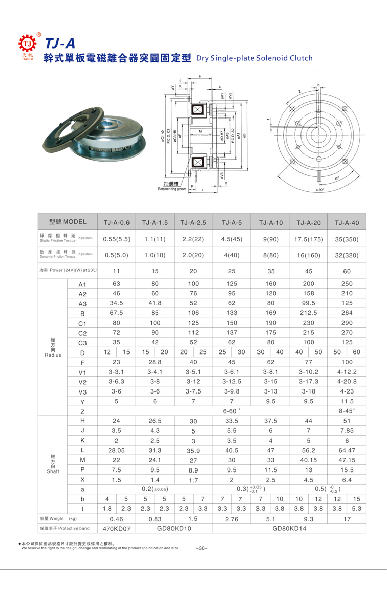 天機傳動摩擦式電磁離合器由銜鐵(電樞板)、定子、轉子、板型彈簧片、磁性線圈、來令片、軸承等元件構成,統一使用DC24V,標準規格0.6-40KG。